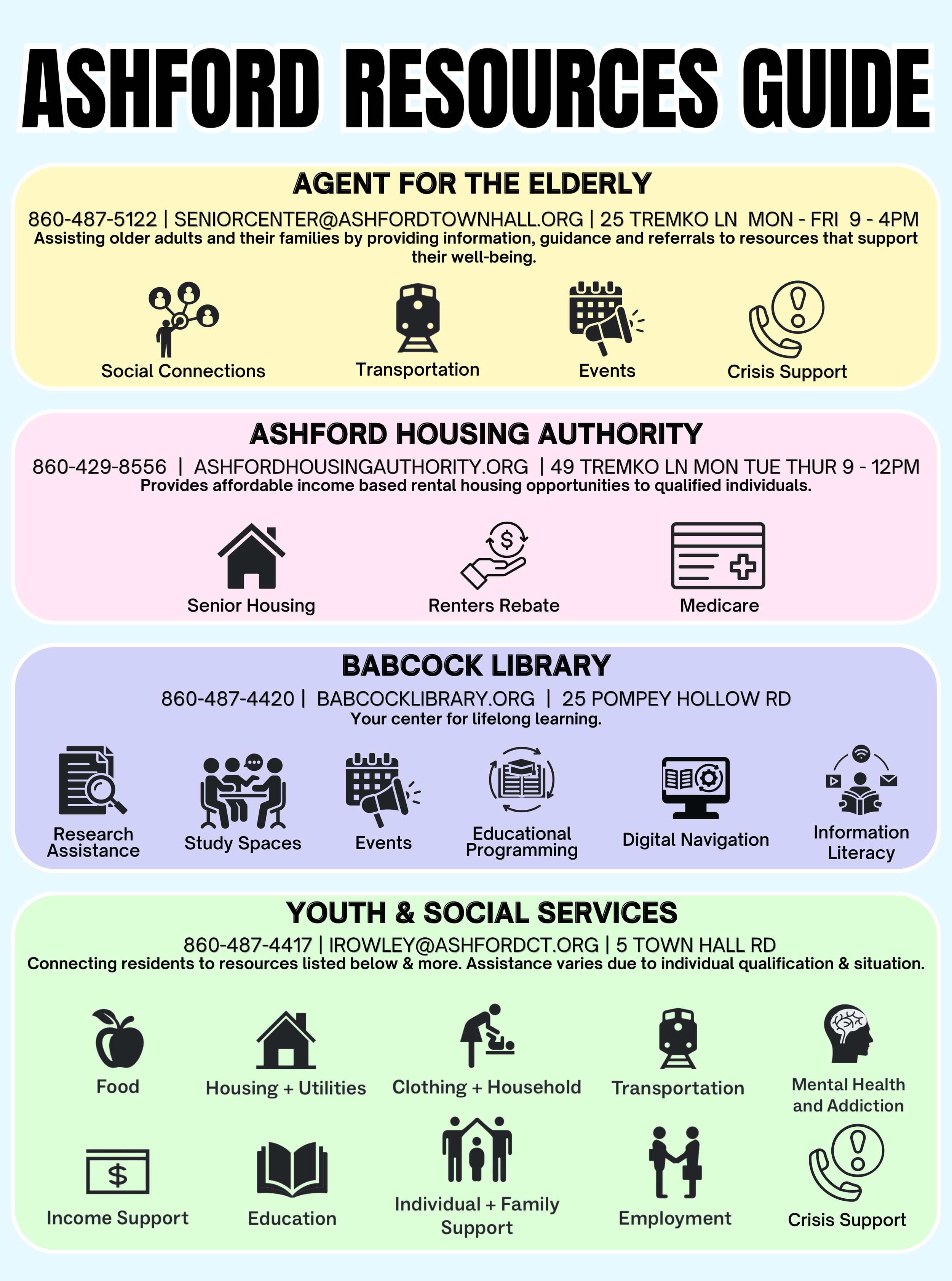 Access Community Action Agency: Access works with low-income populations to help provide resources for food security, affordable housing, and jobs. They run a few senior housing programs in the area, including Parker Place in Tolland, Willington Woods, in Willington, Elisha Brook in Franklin, and Salem Village in Brooklyn. Their website is www.accessagency.org